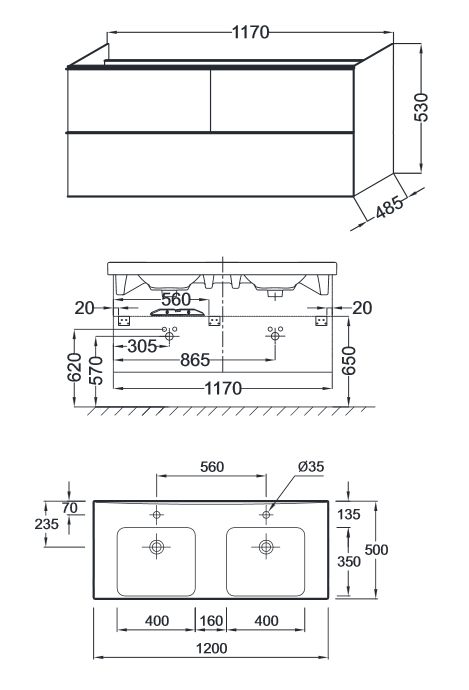 Тумба под две раковины Jacob Delafon Odeon Up 120 подвесная 3 ящика Белая