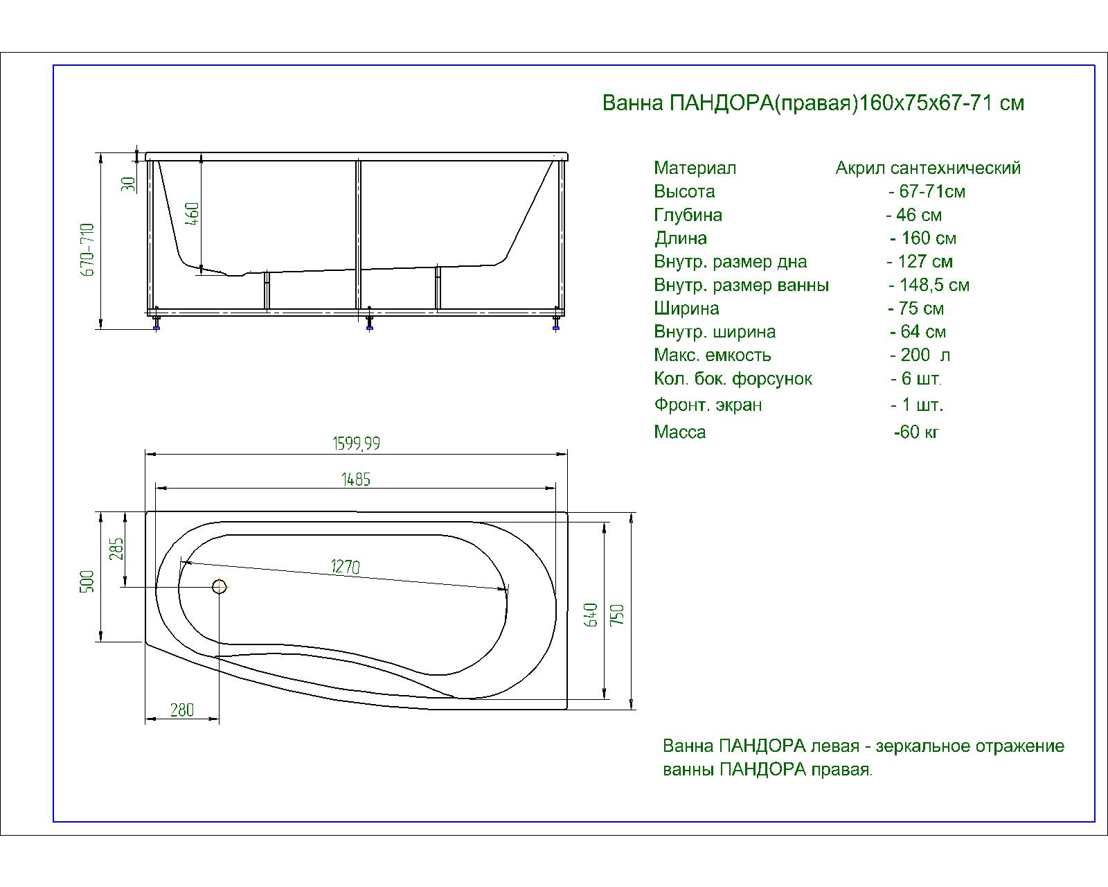Акриловая ванна Aquatek Пандора 160x75 см R пустая с фр.экр.