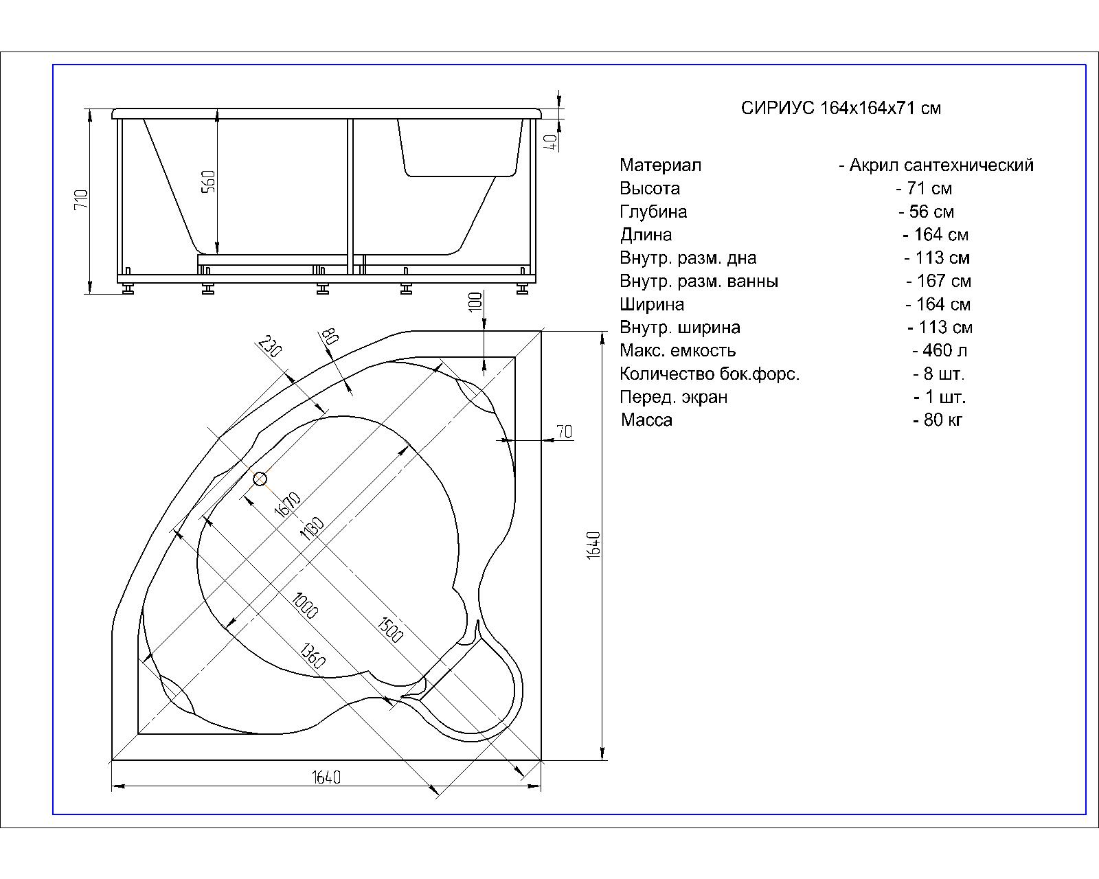 Акриловая ванна Aquatek Сириус 164x164 пустая с фр.экр. вклеенный каркас
