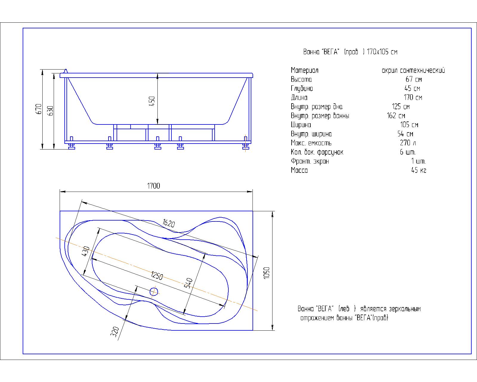 Акриловая ванна Aquatek Вега 170x105 см R пустая с фр.экр.