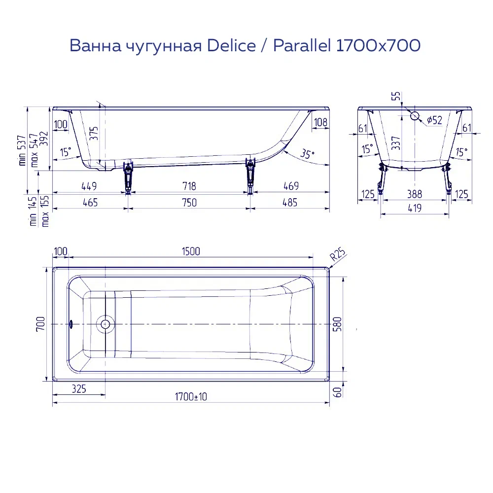 Ванна чугунная Delice Parallel 1700х700, с ручками