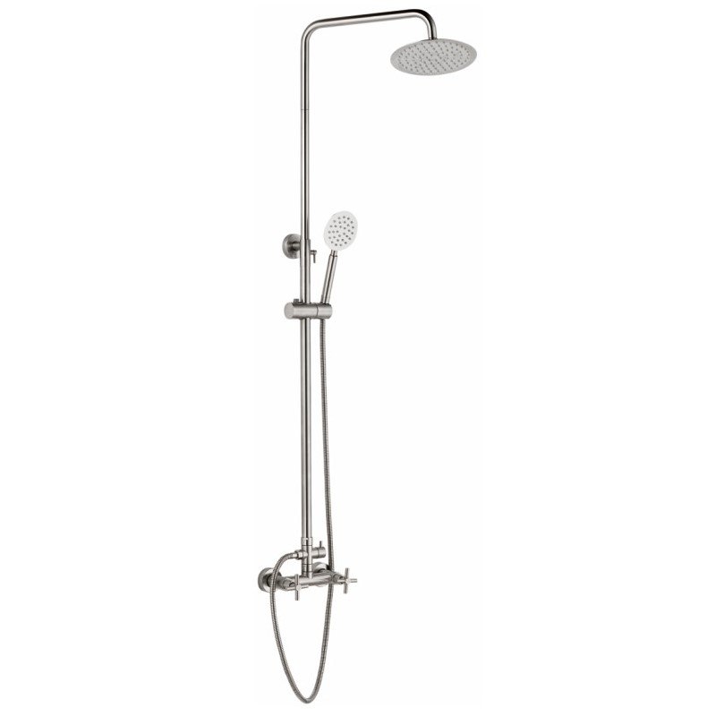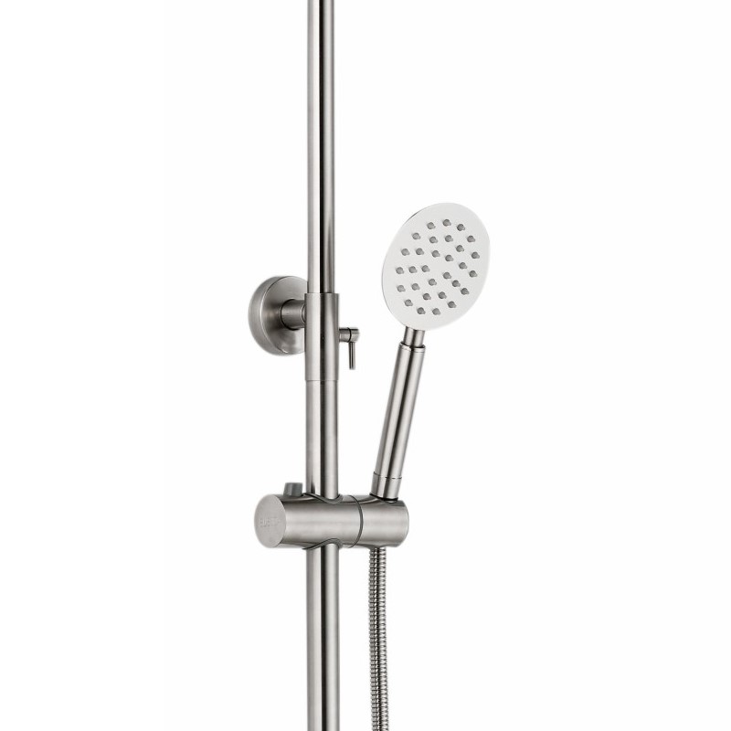 Душевая стойка HB808 пользующегося популярностью производителя Haiba производства Китая чудесно впишется в пространство ванной комнаты и даст возможность легко проделывать все гигиенические процедуры. Ее высота составляет 153.5 см, длина шланга 150 см, а размер лейки см. Из-за качественного материала изготовления - нержавеющей стали, поверхность системы обладает устойчивостью к образованию налета, отложений и царапин, и в довесок не требует дополнительных усилий для поддержания чистоты. Интересный и изысканный дизайн модели и цвет - сталь, сделают ее отличным акцентом в убранстве душевой. Стойка произведена согласно всем нормам отечественных и европейских стандартов и располагает гарантийным сроком - 5 лет. Артикул модели HB24808. Верхний душ легко регулируется, что позволяет откорректировать оптимальный угол наклона при использовании.