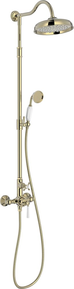 Душевая стойка Cleo популярного производителя Jacob Delafon производства Франции превосходно дополнит пространство ванного помещения и позволит легко проводить все водные манипуляции. Ее высота составляет 133 см, длина шланга 160 см, а размер лейки см. Из-за добротного материала исполнения - латуни, поверхность системы обладает устойчивостью к появлению налета, отложений и сколов, а также не требует значительных усилий при очистке. Привлекательный и лаконичный внешний вид модели и цвет - золото, сделают ее гармоничным акцентом в обустройстве душевой. Стойка сделана в соответствии со всеми номами европейского производства и обладает гарантией - 1 год. Артикул модели E24311-BGG. Верхний душ легко регулируется, что позволяет подобрать удобный угол наклона при эксплуатации.