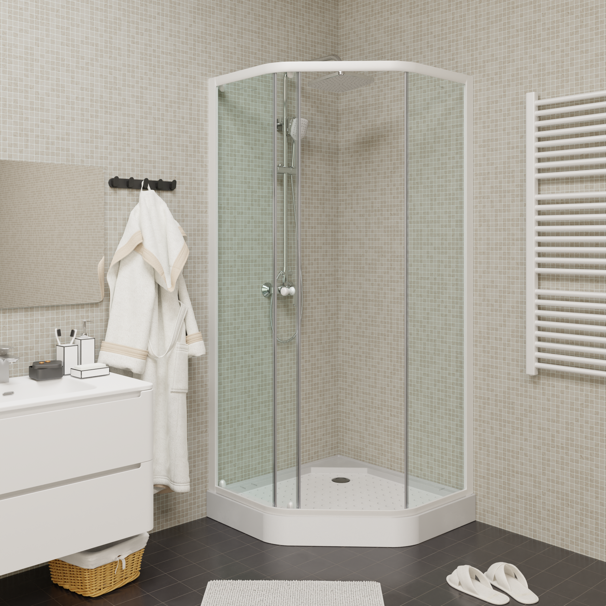 Новый душевой угол Parly 90x90x197 профиль белый, стекло прозрачное - это превосходное сочетание дизайна и функциональности. Форма конструкции - пятиугольная, Выполнена модель в Китая из современных материалов и гармонично дополнит любой интерьер ванного помещения. Изделие ценового сегмента изготовлено в размерах: ширина 90 см, глубина 90 см, высота 197 см, что делает его вполне эргономичным. Профиль из алюминия обеспечивает дополнительную прочность модели, препятствует появлению коррозии. Раздвижные двери расположены спереди, открываются стандартно и имеют прозрачное покрытие. Уголок для душа коллекции Bianco устанавливается на поддон, безупречно выполняет свои функции и не требует значительных усилий для поддержания чистоты. Гарантия на изделие компании Parly - 1 год.