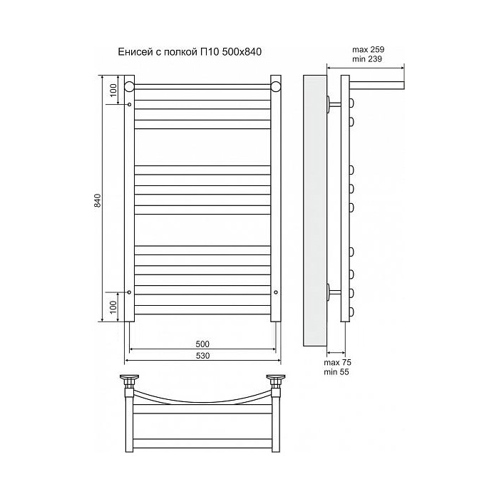 Полотенцесушитель электрический Terminus Енисей П10 500x840 с полкой, ТЭН HT-1 300W, левый/правый