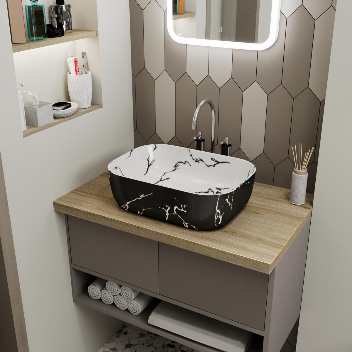Раковины-чаши сегодня имеют ошеломительный успех и позволяют предельно эффективно использовать квадратные метры ванной комнаты. Раковина накладная 46см Point Вега PN43711WB белый/черный является модной моделью в этой сфере и предоставляет возможность не только удобно реализовать все гигиенические потребности, но и делает интерьер помещения более гармоничным. Функциональности этому умывальнику прибавляет прямоугольная форма и удачное решение выполнения чаши без отверстий под смеситель. Материал выполнения - фарфор, котируется за свою надежность, не требует дополнительных усилий для очистки и замечательно сохраняет весь цветовой спектр. Чаша устанавливается просто - к столешнице и отлично гармонирует с разными товарами бренда Point, а гарантия на умывальник действует 10 лет. Изделие, как и все представители коллекции Вега, произведено в оригинальном ключе. Ровные линии, мягкие формы, правильные параметры - все это делает такую модель отличным вариантом для любителей комфорта и роскоши. Умывальник производится в Китаю и сделан в размерах: высота 14 см, ширина 46 см., глубина 33 см., что совершенно точно нужно назвать дополнительным положительным мометном для тех, кто стремится оптимально распорядиться каждым сантиметром при планировке душевого помещения.