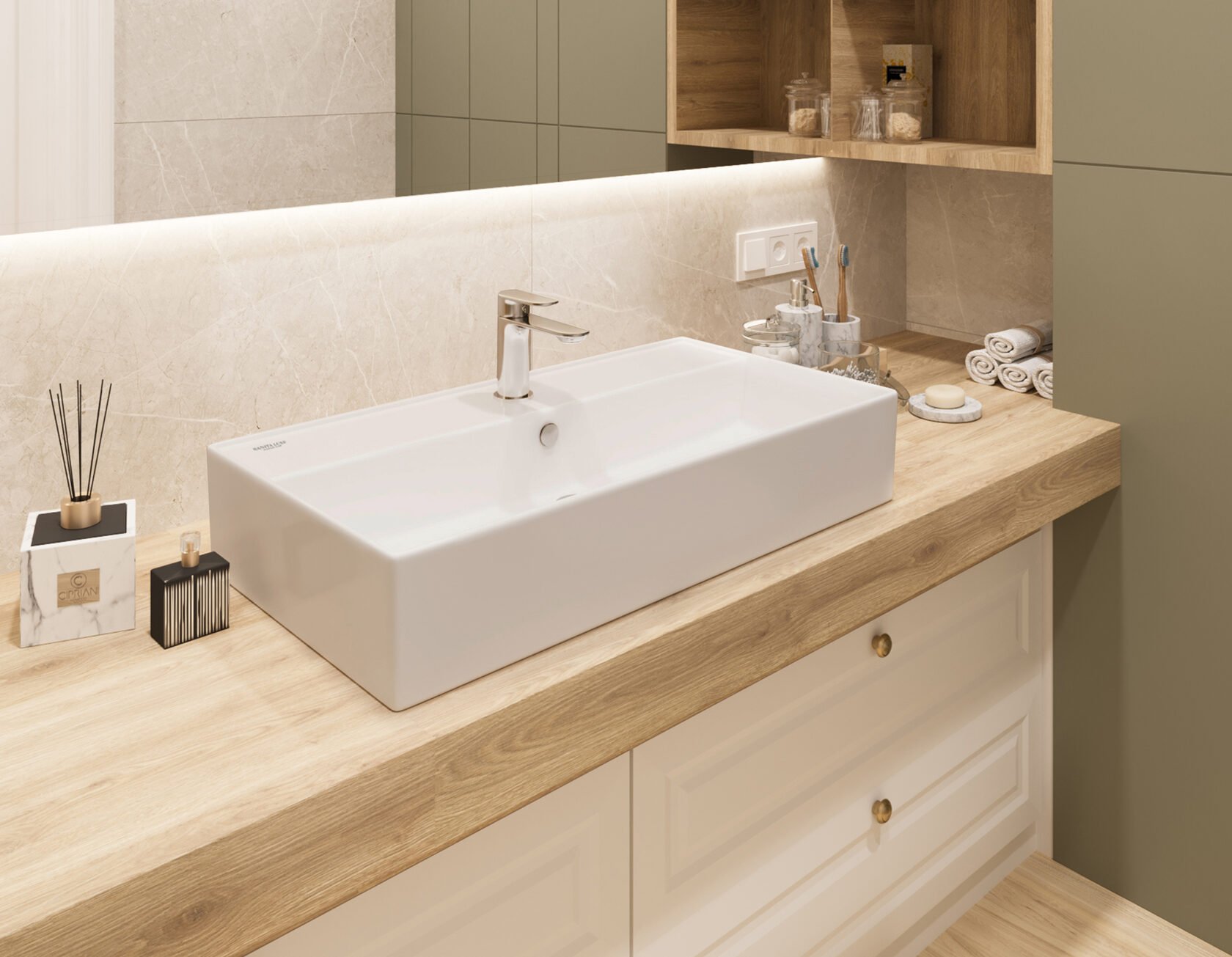 Накладные раковины сейчас имеют ошеломительный успех и дают возможность очень эффективно использовать квадратные метры ванной комнаты. Раковина накладная 80см Sanita Luxe Novel NOV80SLWB01 белый является популярной моделью в этой сфере и дает возможность не только удобно реализовать все гигиенические моменты, но и делает интерьер комнаты более элегантным. Функциональности этому умывальнику прибавляет прямоугольная форма и удачное решение выполнения чаши на 1 отверстие под смеситель. Материал производства - фарфор, высоко ценится за свою надежность, не требует больших усилий по уходу и великолепно сохраняет яркие краски в цвете. Чаша располагается легко - к столешнице и отлично сочетается с различными товарами бренда Sanita Luxe, а гарантия на умывальник составляет 15 лет. Изделие, как и другие представители коллекции Novel, произведено в изысканном стиле. Ровные линии, округлые формы, правильные параметры - все это делает такую модель хорошим решением для почитателей комфорта и роскоши. Умывальник производится в России и выполнен в размерах: высота 16 см, ширина 80.5 см., глубина 42.3 см., что совершенно точно нужно назвать большим преимуществом для тех, кто настроен правильно распорядиться каждым сантиметром при планировке душевого помещения.