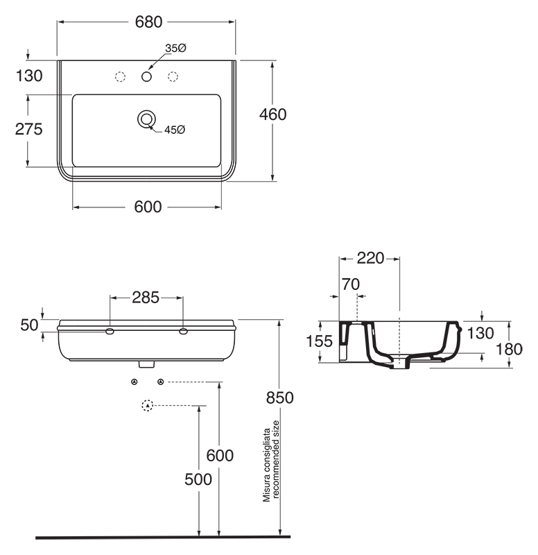 Раковина полувстраиваемая 68см Azzurra Charme CHA268bi*1 белый