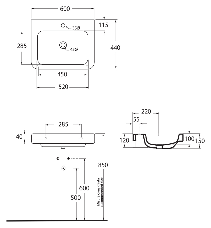 Раковина полувстраиваемая 60см Azzurra Tulip TUL260Tbi*3 белый