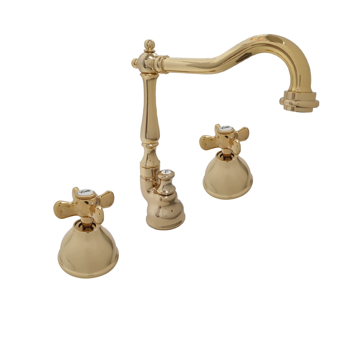 Смеситель для раковины Webert Ottocento OT750202010, золото - новая модель изысканной формы с лаконичным дизайном, которая великолепно дополнит дизайн ванного помещения. Благодаря простому монтажу на раковину и вентильному управлению изделие очень комфортно в быту. Новая технология конструкции даст возможность уменьшить расход воды, при этом настроить напор и температуру достаточно просто. Модель коллекции Ottocento сделана из прочного материала - латуни, устойчивого к коррозии, а защитное покрытие гарантирует идеальный блеск излива на период всего срока службы. Это изделие относится к ценовому сегменту и рассчитано на 3 отверстия для монтажа. Гарантийный период на товар фирмы Webert - 5 лет, так что клиенты могут не сомневаться в его добротности и прочности.