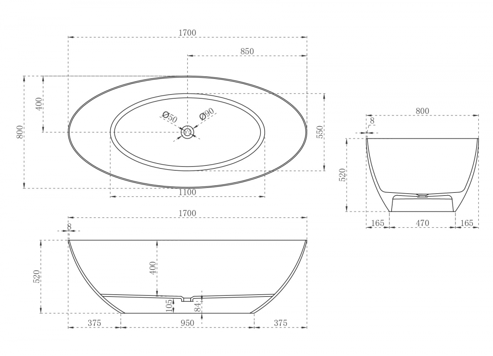 Ванна из искусственного камня ABBER Stein AS9625-1.7 белая матовая