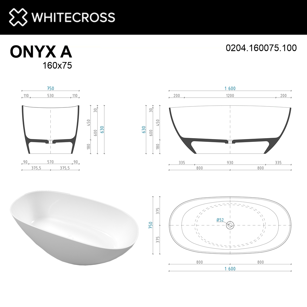 Ванна WHITECROSS Onyx A 160x75 (белый глянец) иск. камень