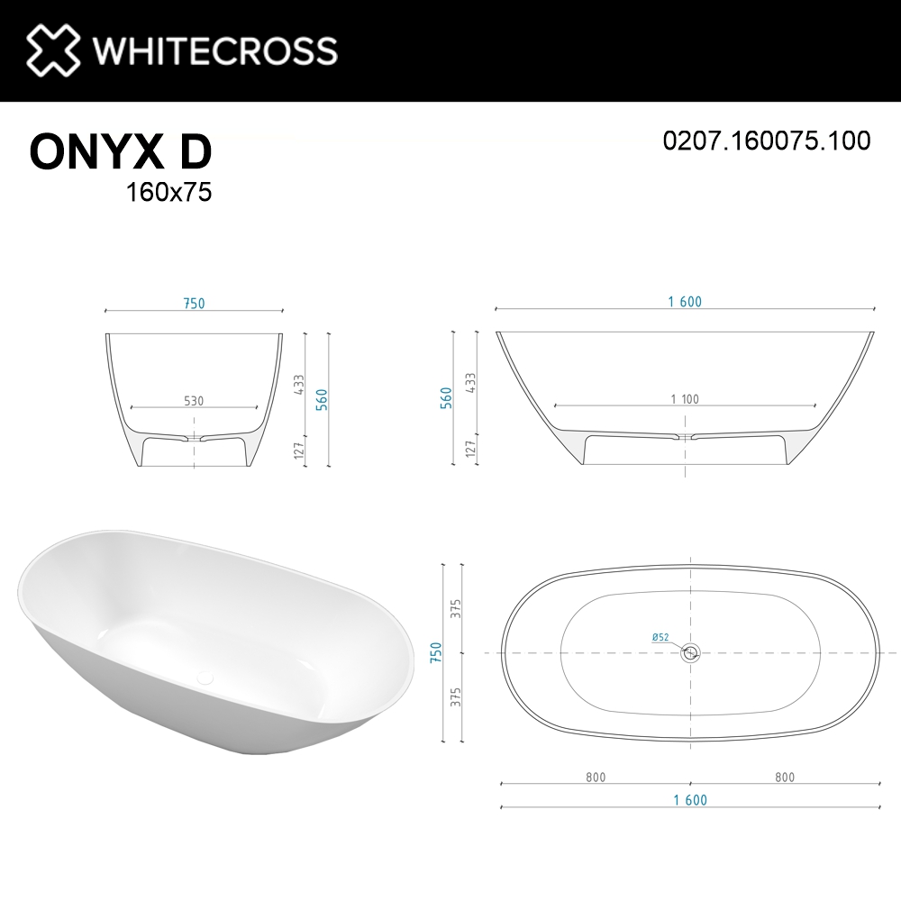 Ванна WHITECROSS Onyx D 160x75 (белый глянец) иск. камень