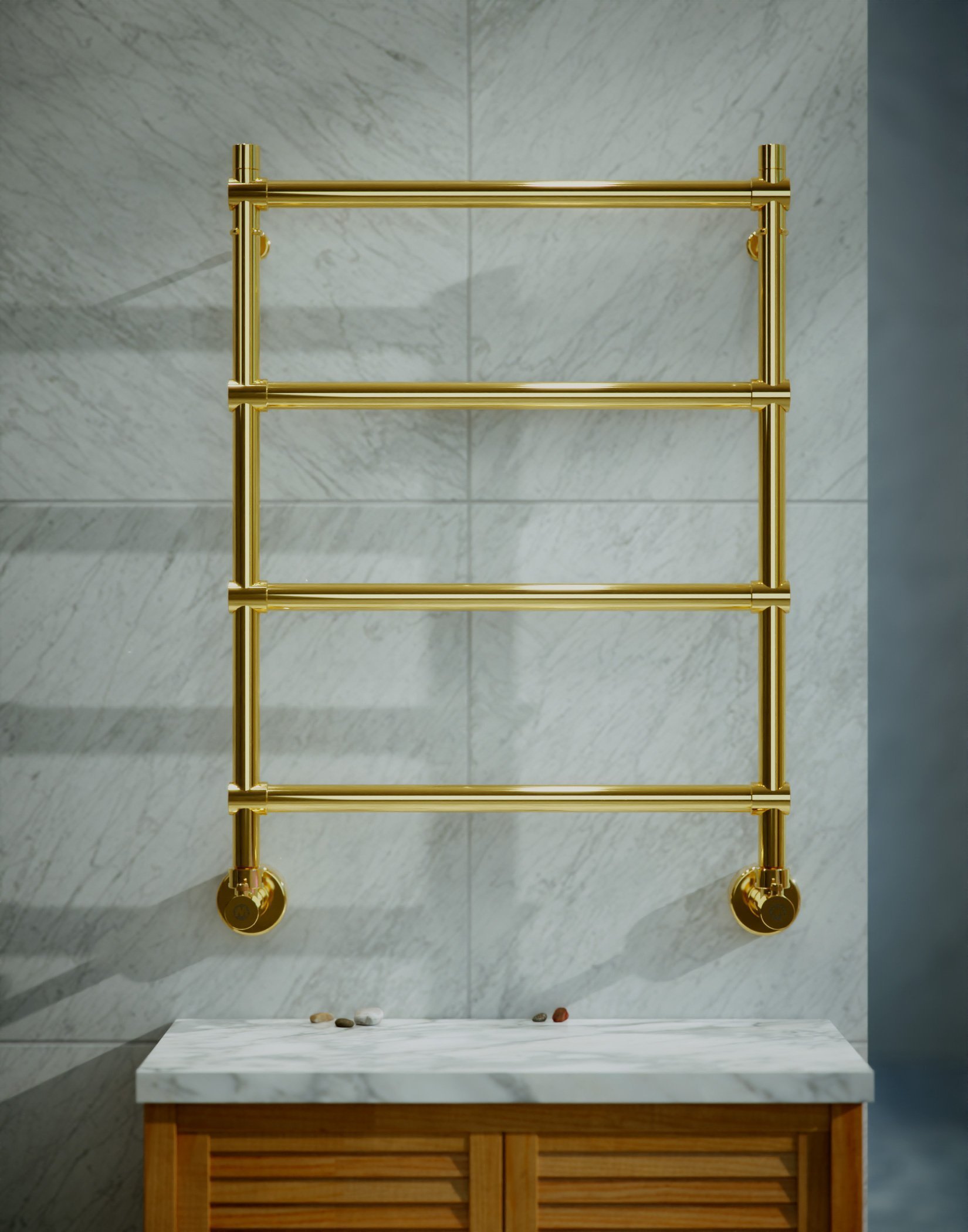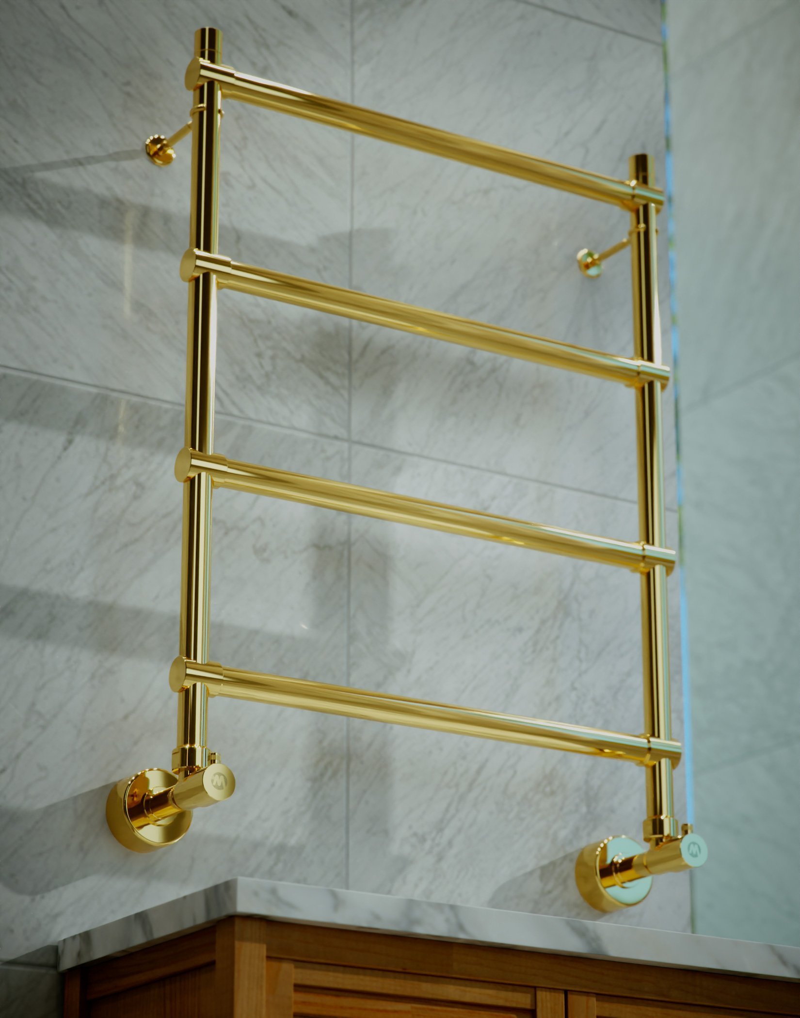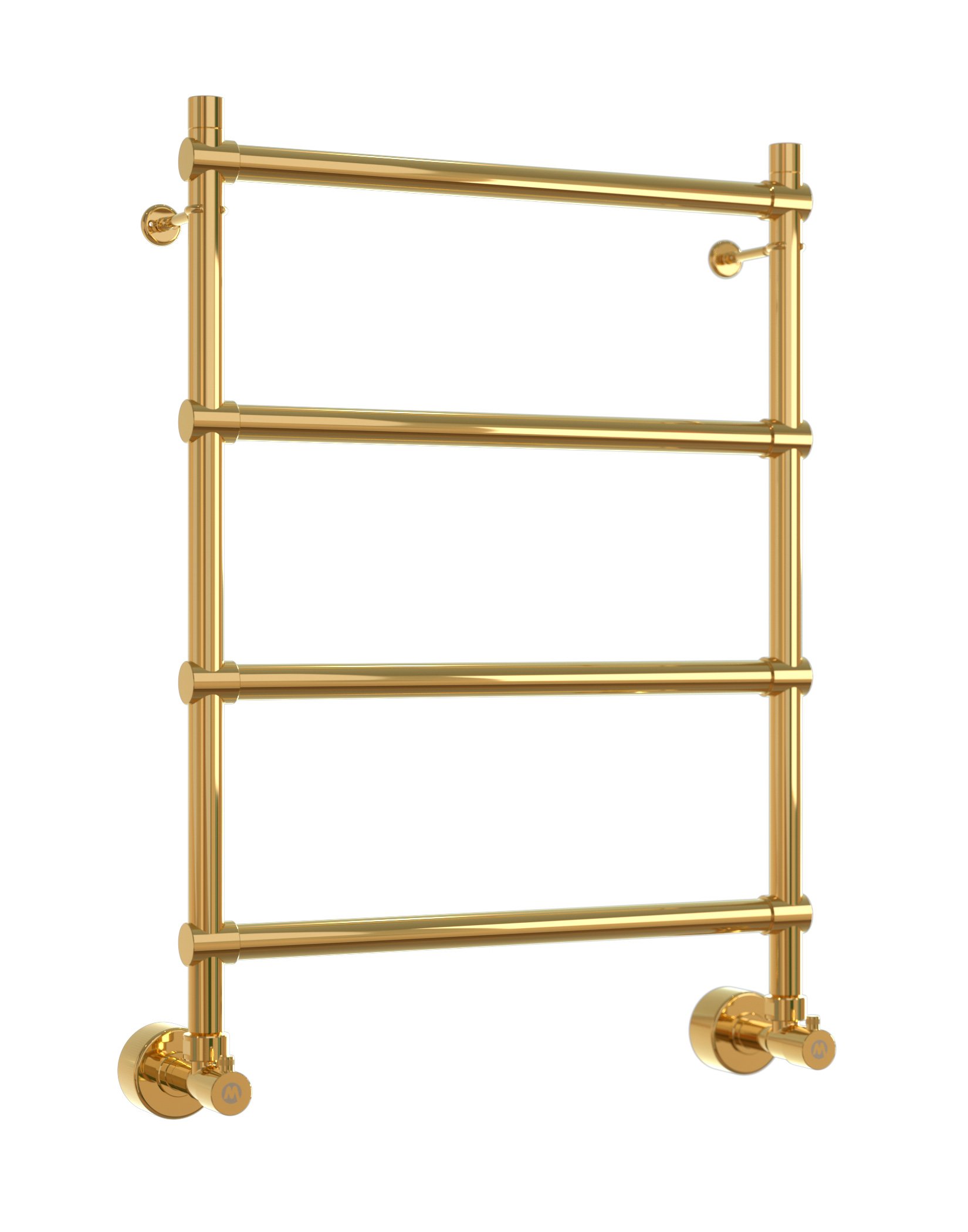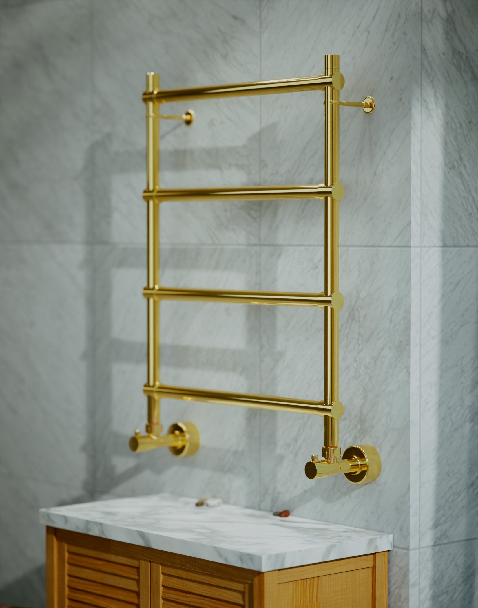 Полотенцесушитель водяной Margaroli Sole 4424704GON 72х53 золото - популярная модель, изготовленная из ударопрочного материала - латуни, которая предусматривает обогрев всего пространства. Отопительное оборудование имеет форму лесенку и размеры: ширина - 53 см, глубина - 13.5 см, высота - 72 см., что позволяет ему идеально разместиться в пространстве комнаты. Межосевой промежуток равен 50 см, а диаметр подводки достигает 1/2 дюйма. Подвесной санмонтаж и горизонтальное или нижнее направление подключения дают возможность без проблем расположить полотенцесушитель и подключить его к системе центрального отопления или к системе горячего водоснабжения. Модель линейки Sole великолепно справляется с неожиданными изменениями давления или температуры, а выверенная конструкция гарантирует долгий период эксплуатации. Гарантия на товар бренда Margaroli составляет 5 лет. Модель заслужено называется лучшей в своей ценовой категории, производится в Италии и качественно выполняет свои функции.