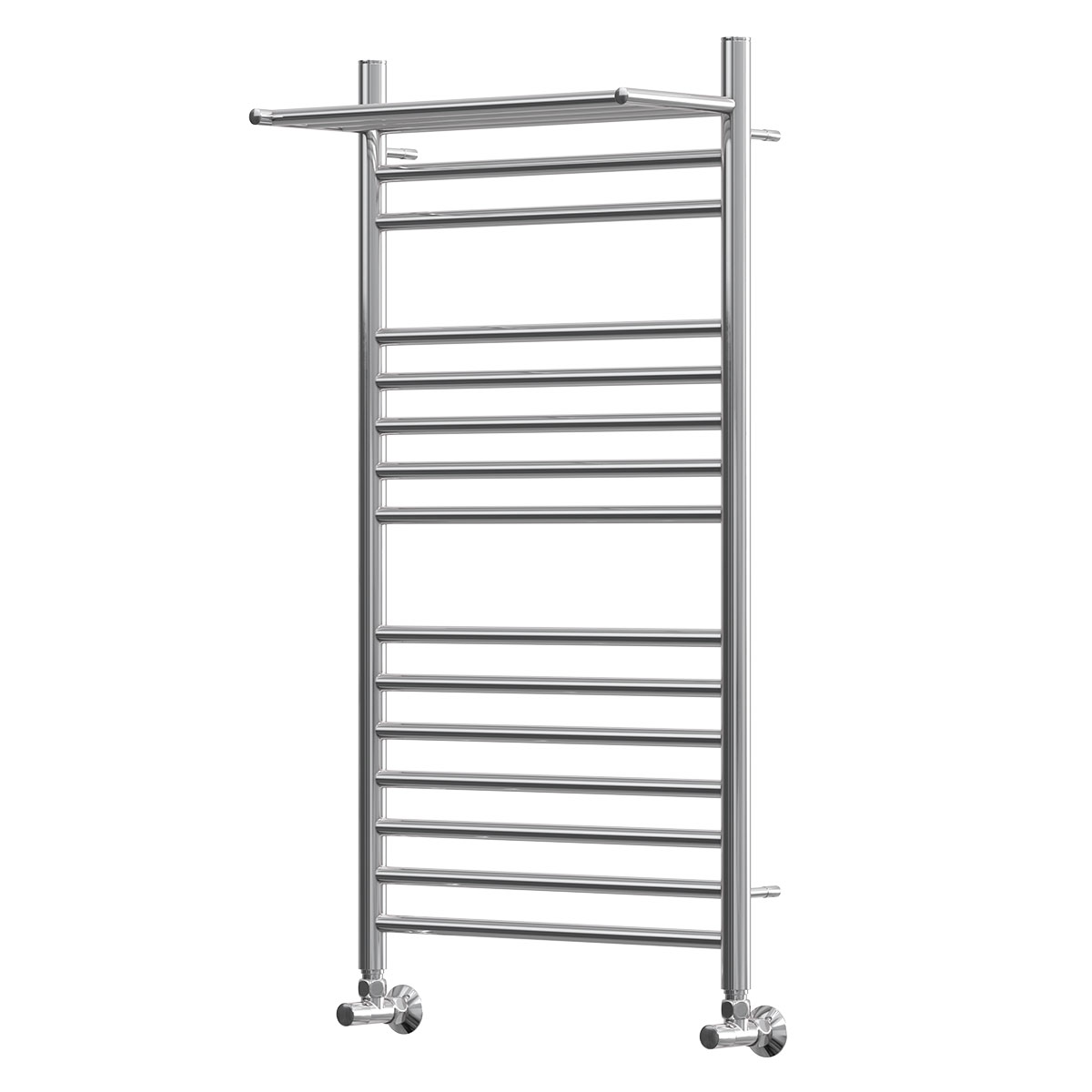 Полотенцесушитель водяной Point PN10150SP П14 500x1000 с полкой, хром - новая модель, изготовленная из надежного материала - нержавеющей стали, которая эффективно выполняет обогрев помещения. Отопительное оборудование имеет форму лесенку и параметры: ширина - 53.2 см, глубина - 25.1 см, высота - 100 см., что дает возможность ему идеально вписаться в пространство комнаты. Межосевой интервал составляет 50 см, а диаметр подводки достигает 1/2 дюйма. Подвесной санмонтаж и горизонтальное, нижнее направление подключения дают возможность без заминок расположить полотенцесушитель и подключить его к системе горячего водоснабжения. Модель линейки Серия 10 замечательно справляется с перепадами давления или температуры, а выверенная конструкция гарантирует долговременный период эксплуатации. Гарантийное обслуживание на товар бренда Point действует 15 лет. Модель считается лучшей в своей ценовой категории, производится в России и безотказно выполняет свои функции.