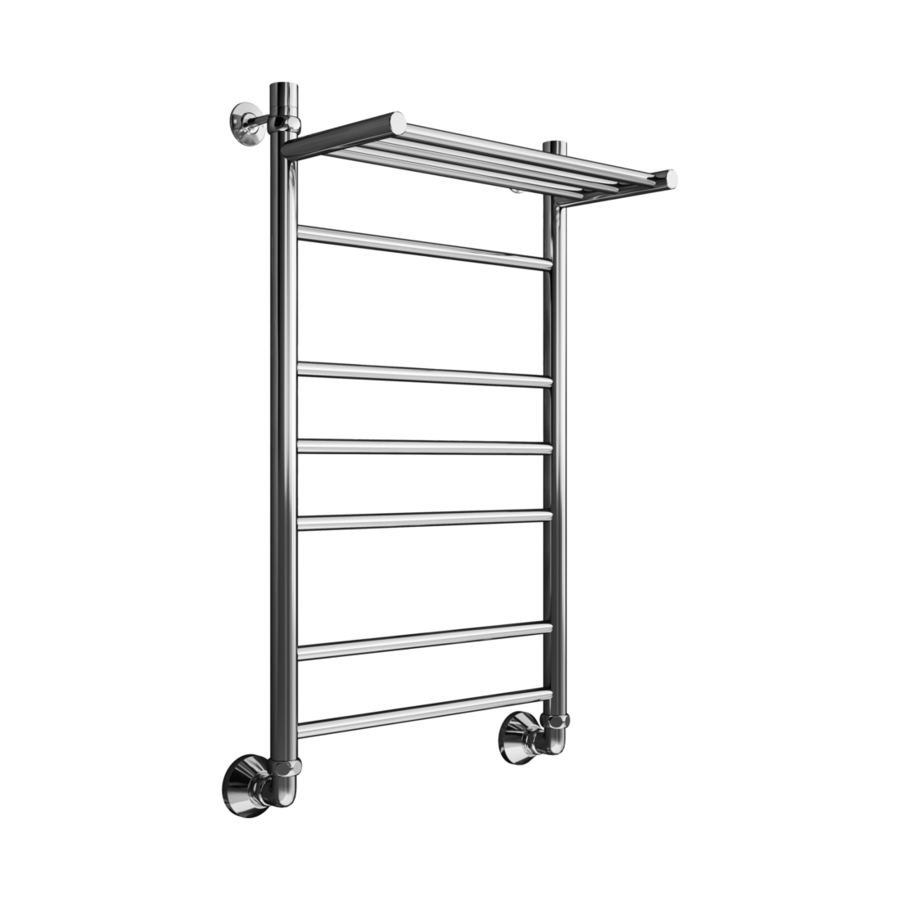 Полотенцесушитель водяной с полкой Маргроид Вид 10 80х50 хром - известная модель, выполненная из надежного материала - нержавеющей стали, которая предусматривает обогрев всего пространства. Оборудование имеет форму лесенку и размеры: ширина - 50 см, глубина - 25.7 см, высота - 80 см., что дает возможность ему прекрасно вписаться в пространство помещения. Межосевой промежуток равен 50 см, а диаметр подводки достигает 3/4 дюйма. Подвесной монтаж и горизонтальное, вертикальное, диагональное, боковое, нижнее направление присоединения дают возможность быстро разместить полотенцесушитель и подключить его к системе центрального отопления, к системе горячего водоснабжения. Модель линейки Вид 10 превосходно справляется с внезапными перепадами давления или температуры, а продуманная конструкция обеспечивает долгий период использования. Официальная гарантия на товар бренда Маргроид составляет 10 лет. Модель является лучшей в своей ценовой категории, производится в России и отлично выполняет свои функции.