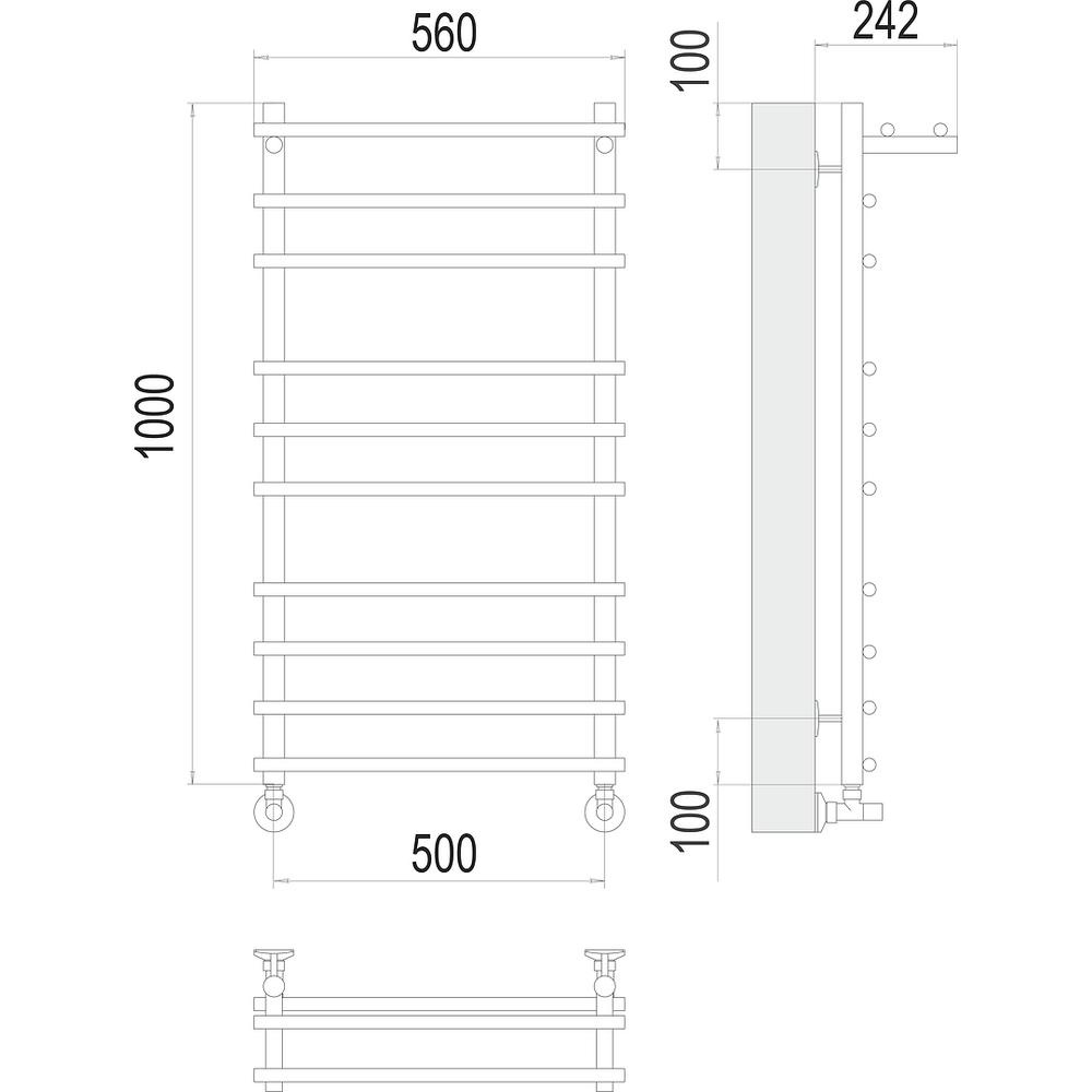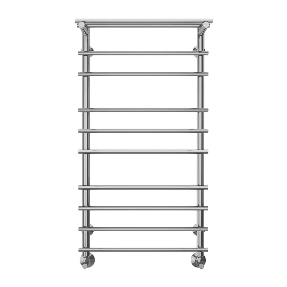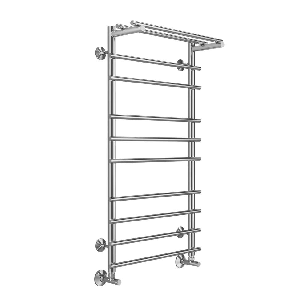 Полотенцесушитель водяной с полкой Terminus Ватра П10 50х100 - известная модель, изготовленная из прочного материала - нержавеющей стали, которая предусматривает обогрев всего помещения. Отопительное оборудование имеет форму лесенку и размеры: ширина - 56 см, глубина - 24.2 см, высота - 100 см., что разрешает ему идеально разместиться в пространстве душевой. Межосевой промежуток составляет 50 см, а диаметр подводки достигает дюйма. Подвесной санмонтаж и горизонтальное, нижнее направление присоединения дают возможность без заминок расположить полотенцесушитель и подключить его к системе горячего водоснабжения. Модель линейки Ватра превосходно справляется с резкими изменениями давления или температуры, а выверенная конструкция обеспечивает длительный период эксплуатации. Гарантийное обслуживание на товар бренда Terminus составляет 10 лет. Модель считается лучшей в своем ценовом сегменте, производится в России и безотказно выполняет свои функции.