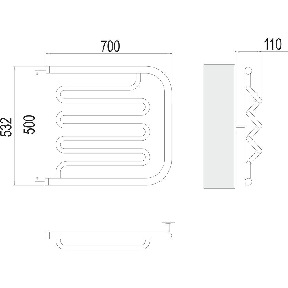 Полотенцесушитель водяной Terminus Фокстрот-Лиана 500x700 - популярная модель, выполненная из надежного материала - нержавеющей стали, которая предусматривает обогрев всего пространства. Отопительное оборудование имеет форму U-образную и параметры: ширина - 70 см, глубина - 12 см, высота - 53.2 см., что дает возможность ему прекрасно разместиться в пространстве душевой. Межосевой промежуток равен 50 см, а диаметр подводки достигает 1 дюйма. Подвесной санмонтаж и вертикальное или боковое направление подключения дают возможность в два счета расположить полотенцесушитель и подключить его к системе горячего водоснабжения или к системе центрального отопления. Модель линейки Фокстрот-Лиана великолепно справляется с перепадами давления или температуры, а специальная конструкция гарантирует продолжительный срок эксплуатации. Гарантийное обслуживание на товар бренда Terminus составляет 10 лет. Сушилка для полотенец заслужено называется лучшей в своем ценовом классе, изготавливается в России и отлично выполняет свои задачи.