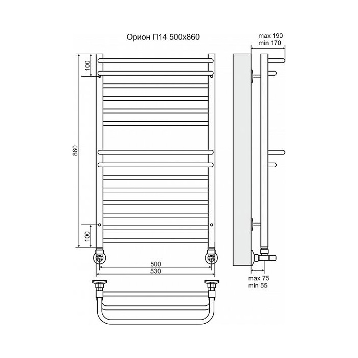 Полотенцесушитель водяной Terminus Орион П14 500x860 - функциональная модель, выполненная из прочного материала - нержавеющей стали, которая эффективно выполняет обогрев помещения. Оборудование имеет форму лесенку и параметры: ширина - 53 см, глубина - 17 см, высота - 86 см., что дает возможность ему идеально расположиться в пространстве душевой. Межосевой промежуток равен 50 см, а диаметр подводки достигает 1/2 дюйма. Подвесной санмонтаж и горизонтальное или нижнее направление подсоединения дают возможность без проблем установить полотенцесушитель и подключить его к системе горячего водоснабжения или к системе центрального отопления. Модель линейки Орион замечательно справляется с перепадами давления или температуры, а продуманная конструкция гарантирует долгий срок эксплуатации. Гарантийное обслуживание на товар бренда Terminus составляет 10 лет. Модель заслужено называется лучшей в своем ценовом классе, изготавливается в России и качественно выполняет свои функции.