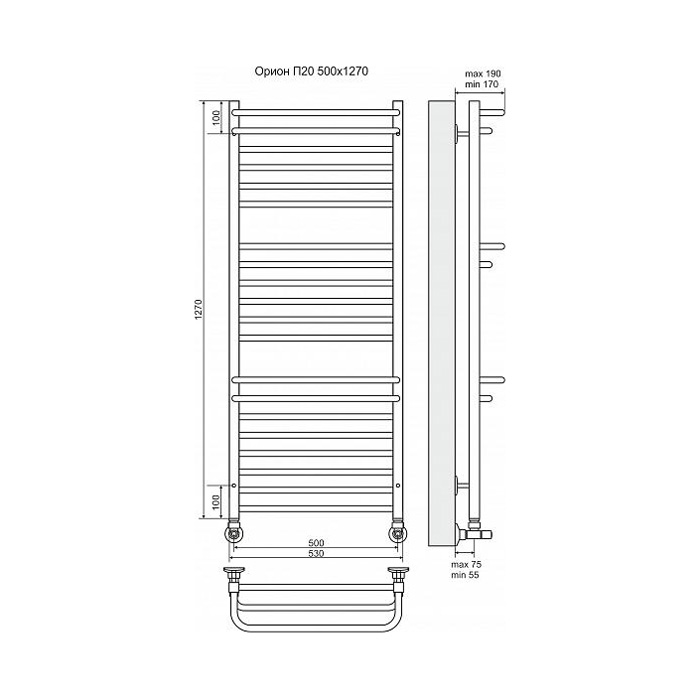 Полотенцесушитель водяной Terminus Орион П20 500x1270 - популярная модель, сделанная из ударопрочного материала - нержавеющей стали, которая предусматривает обогрев всего помещения. Отопительное оборудование имеет форму лесенку и параметры: ширина - 53 см, глубина - 17 см, высота - 127 см., что позволяет ему идеально расположиться в пространстве комнаты. Межосевой промежуток равен 50 см, а диаметр подводки достигает 1/2 дюйма. Подвесной монтаж и горизонтальное или нижнее направление подсоединения дают возможность легко установить полотенцесушитель и подключить его к системе горячего водоснабжения или к системе центрального отопления. Модель линейки Орион замечательно справляется с неожиданными перепадами давления или температуры, а выверенная конструкция гарантирует долгий срок использования. Гарантия на товар бренда Terminus действует 10 лет. Модель заслужено называется лучшей в своей ценовой категории, производится в России и отлично выполняет свои задачи.