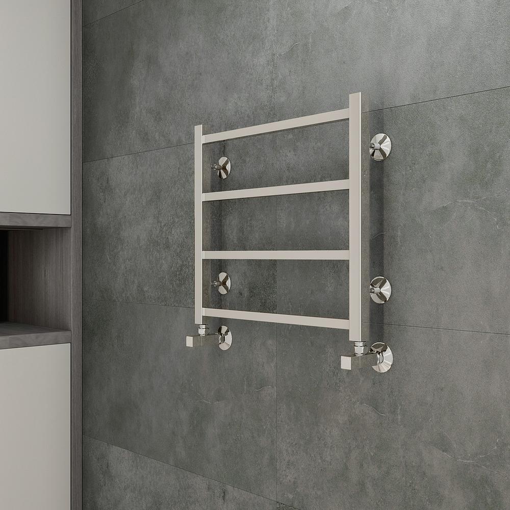 Полотенцесушитель водяной Terminus Ватикан П4 50х50 - известная модель, изготовленная из ударопрочного материала - нержавеющей стали, которая осуществляет равномерный обогрев пространства. Отопительное оборудование имеет форму лесенку и размеры: ширина - 53 см, глубина - 7.4 см, высота - 50 см., что позволяет ему отлично разместиться в пространстве помещения. Межосевой интервал равен 50 см, а диаметр подводки достигает дюйма. Подвесной санмонтаж и горизонтальное, нижнее направление присоединения дают возможность без заминок установить полотенцесушитель и подключить его к системе горячего водоснабжения. Модель линейки Ватикан великолепно справляется с внезапными перепадами давления или температуры, а продуманная конструкция гарантирует длительный срок использования. Официальная гарантия на товар бренда Terminus действует 10 лет. Сушилка для полотенец заслужено называется лучшей в своей ценовой категории, производится в России и качественно выполняет свои функции.