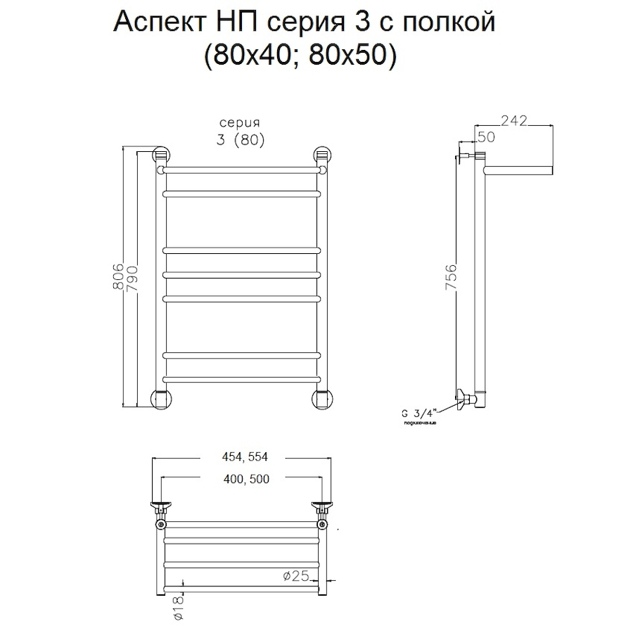 Полотенцесушитель водяной Тругор Аспект серия 3 80х40 хром, с полкой