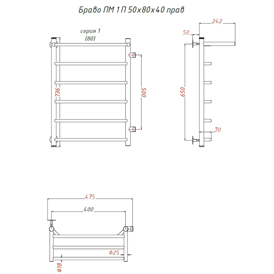Полотенцесушитель водяной Тругор Браво серия 1 73,6х40 хром, с полкой, подключение правое