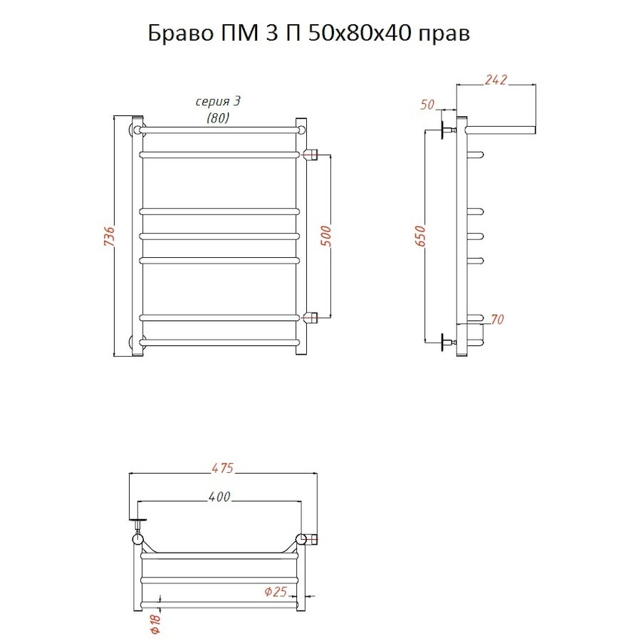 Полотенцесушитель водяной Тругор Браво серия 3 73,6х40 хром, с полкой, подключение правое