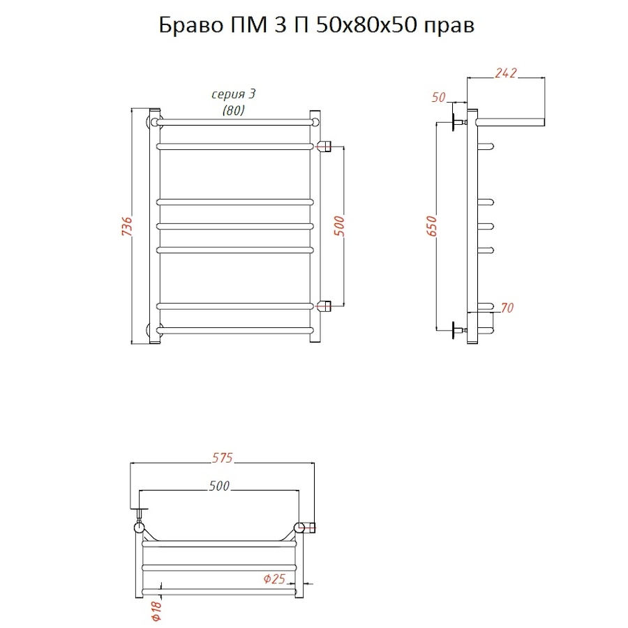 Полотенцесушитель водяной Тругор Браво серия 3 73,6х50 хром, с полкой, подключение правое