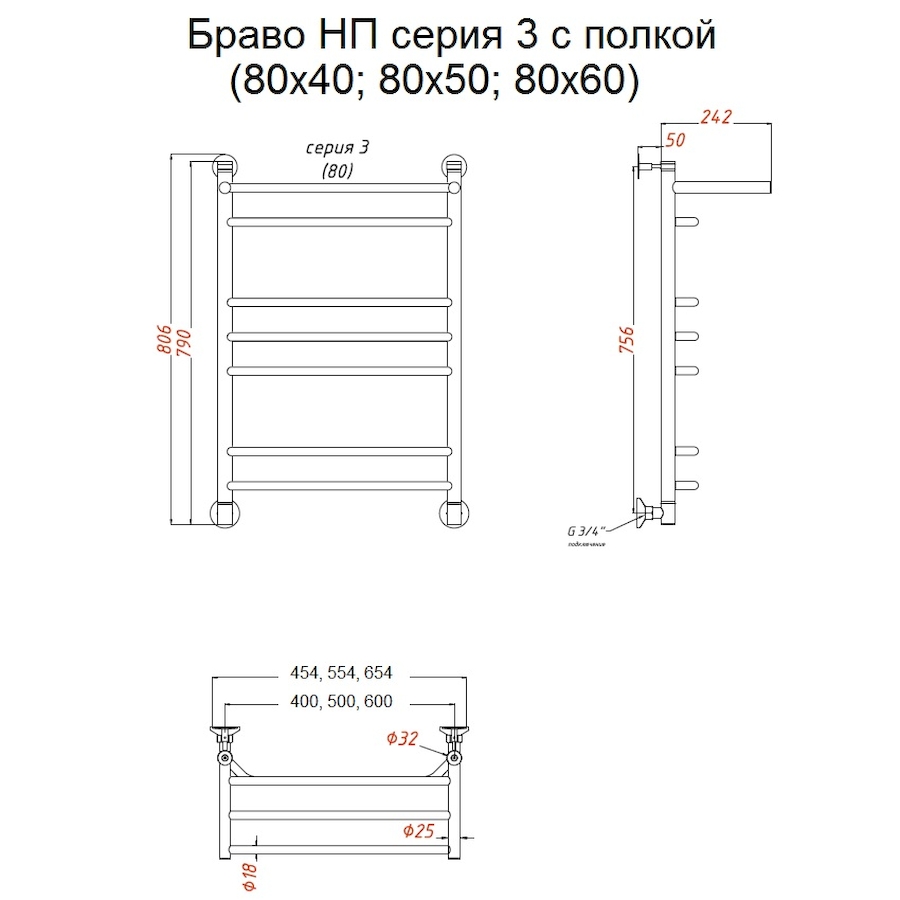 Полотенцесушитель водяной Тругор Браво серия 3 80х50 хром, с полкой