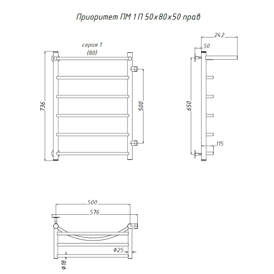 Полотенцесушитель водяной Тругор Приоритет серия 1 73,6х50 хром, с полкой, подключение правое