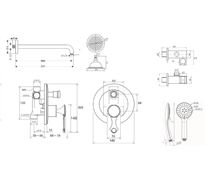 Душевая система встраиваемая Bronze de Luxe YASMINA NT800/B03-2, хром